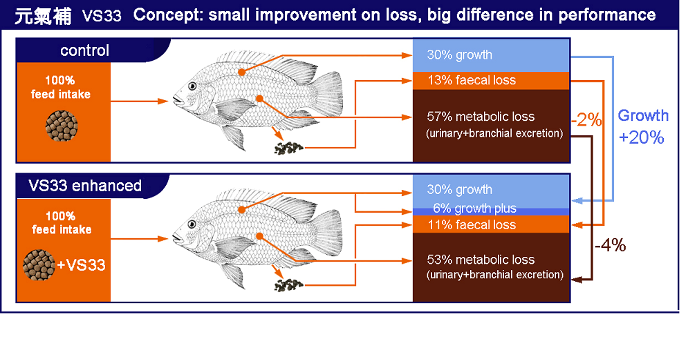 Increase VS33 into your feed formulation can improve nutritive value and get better return by way of high feed intake, better FCR, low mortality and high growth.